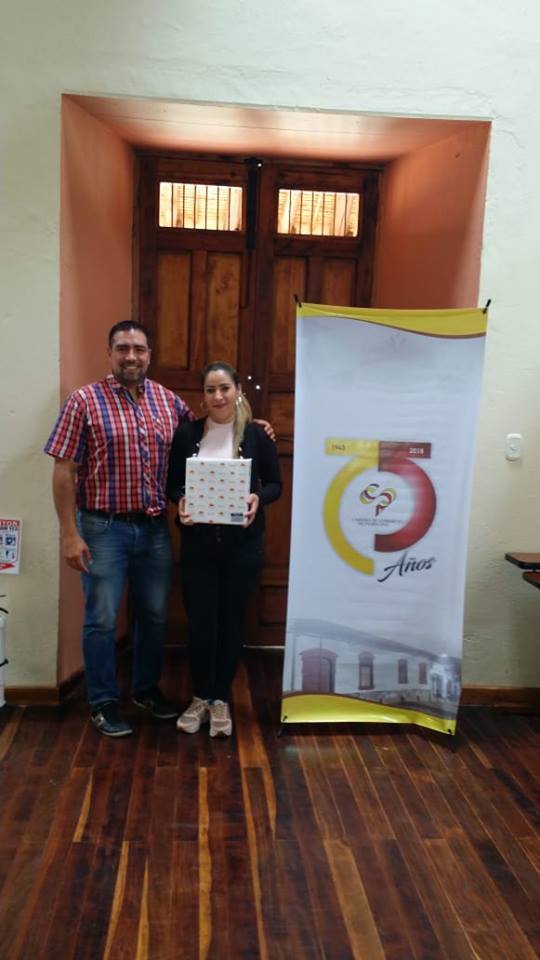 Carlos Humberto Solano Espinosa, Presidente Ejecutivo de la Cámara de Comercio de Pamplona, entregó regalo a nuestra afiliada Mónica Bachué propietaria del establecimiento VELAZCA, por su asistencia al encuentro anual de afiliado 2018 y quien a través de sorteo previo realizado con trasmisión en vivo por nuestras redes sociales fue la feliz ganadora de un detalle sorpresa por parte de la empresa Porvenir seccional Pamplona.